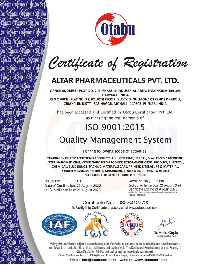 Altar Pharmaceuticals Pvt. Ltd. is a marketing based pharmaceutical company with its main focus on making available quality pharmaceutical products at affordable costs to all. As one of the fast growing pharmaceutical company in India, Altar Pharmaceuticals Pvt. Ltd. management mission is "provide quality products for save life at affordable costs". Our slogan is "A Light of Happiness"